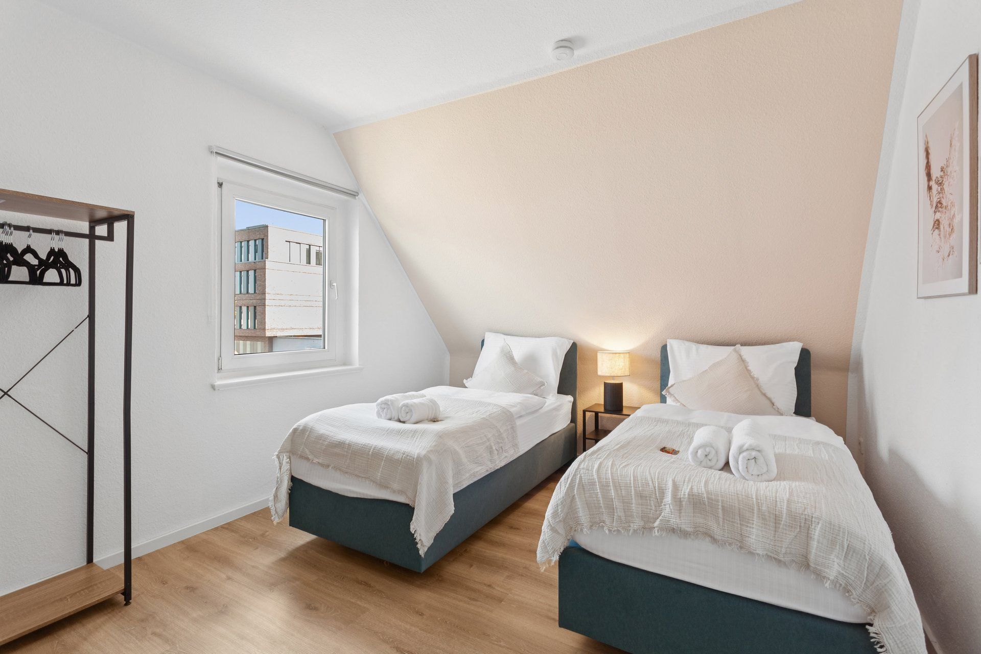 Ein helles, modernes Apartment, das Raum für Erholung und produktive Tage bietet. Fünf bequeme Einzelbetten, eine voll ausgestattete Küche und ein einladender Wohnbereich schaffen den perfekten Rückzugsort nach einem langen Tag. Ideal für Gäste, die Komfort und Funktionalität schätzen.